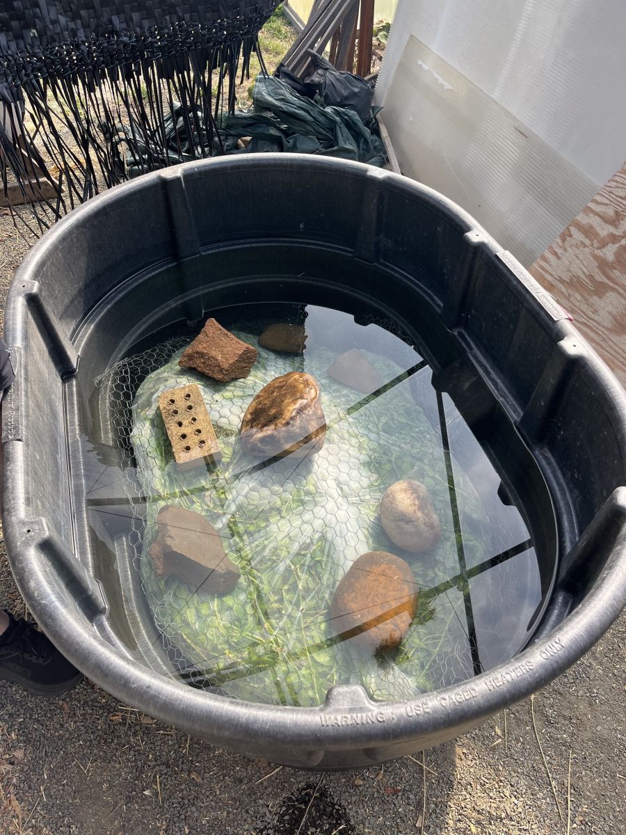 After harvest, the indigo stalks are placed into a mesh bag, covered in wire, and submerged in a large basin filled with water. The bag of indigo, which Quaintance likens to a large teabag, is weighted underwater with rocks. The indigo ‘teabag’ remains underwater in the basin for several days, fermenting until the water becomes a beautiful mermaid blue. After a process of aeration, adding calcium hydroxide, and waiting for the pigment to settle, the “mermaid water” turns into a recognizable indigo color. At the bottom of the basin is indigo dye in sludge-form, which Quaintance extracts by siphoning off the water that has settled out on top.