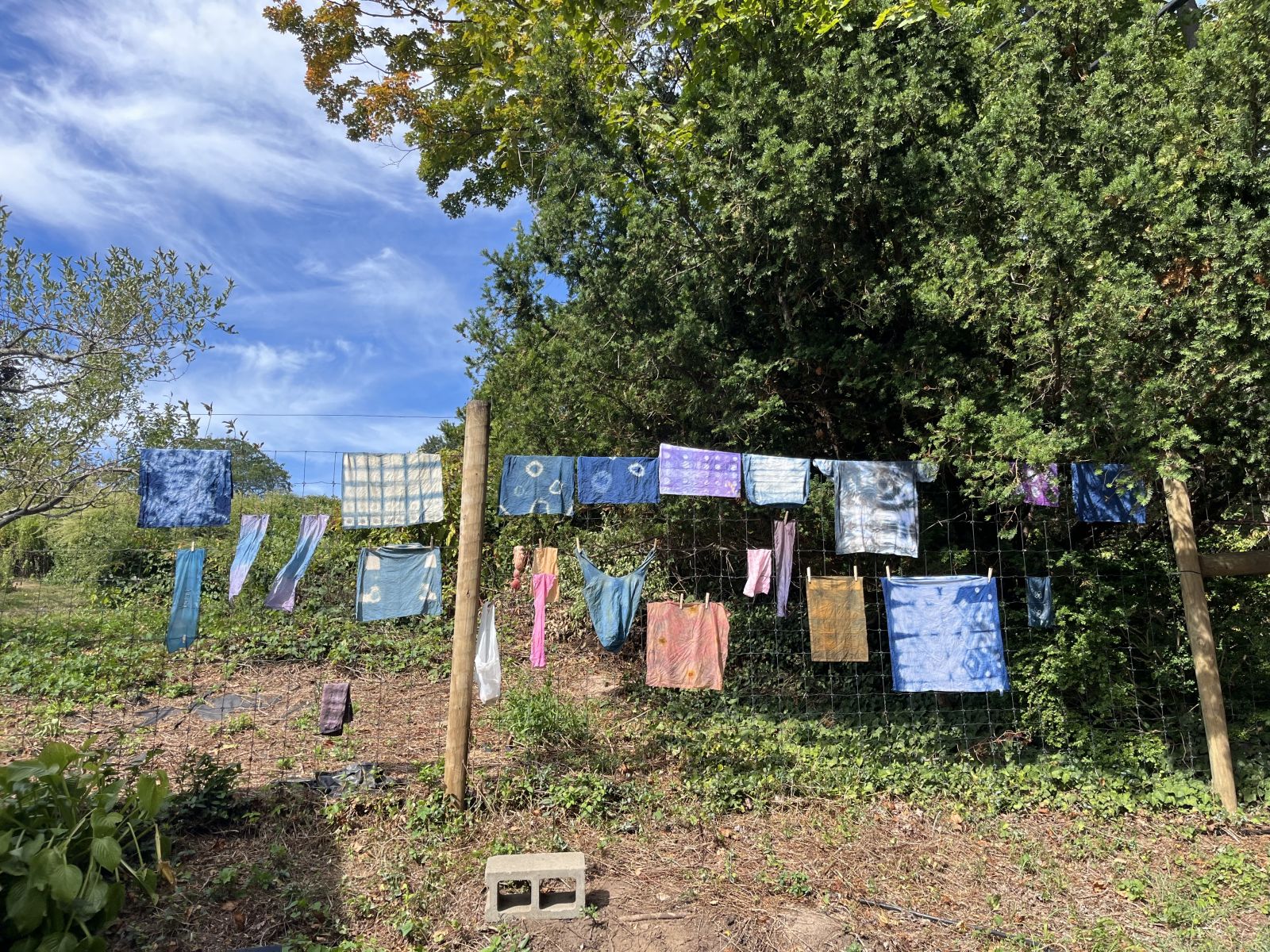 Textiles dyed with indigo and various other natural dyes drying at the Farm